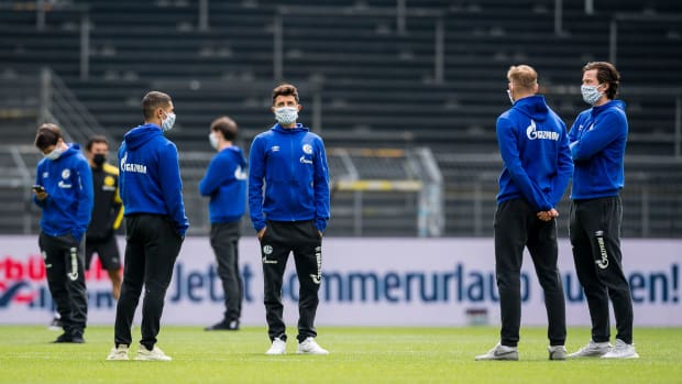 Jobst and Schneider said that worried players were given the opportunity to back out of the return to play without repercussion, but all were willing to comply. They entered quarantine at the beginning of last week inside a Courtyard Marriott located just a block north of Schalke’s stadium. A nice change of pace for the players was that everyone got his own room. The tough part was that besides training each day and meals—during which players had to eat two meters apart—they had to stay in them. There was 24-hour security on each of the three floors occupied by players and coaches, as well as outside the hotel. They had their own entrance, and anyone going in or out had their temperature taken.